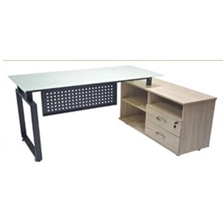 El escritorio NGI combina diseño moderno con funcionalidad. Vidrio templado, mueble lateral con cajones y porta CPU, y un elegante faldero metálico para mayor soporte estructural y estilo ejecutivo.